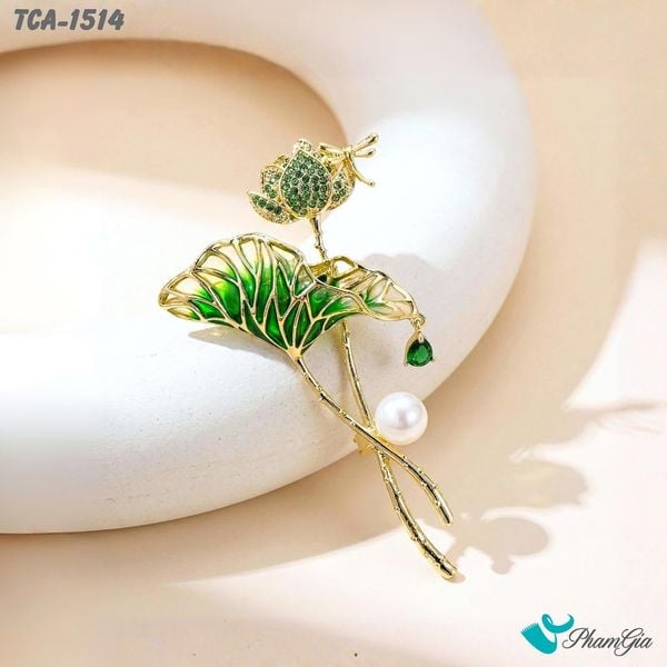 Ghim Cài Áo Sen Xanh Tráng Men Đính Đá Ngọc Trai Trang Nhã (TCA1514)