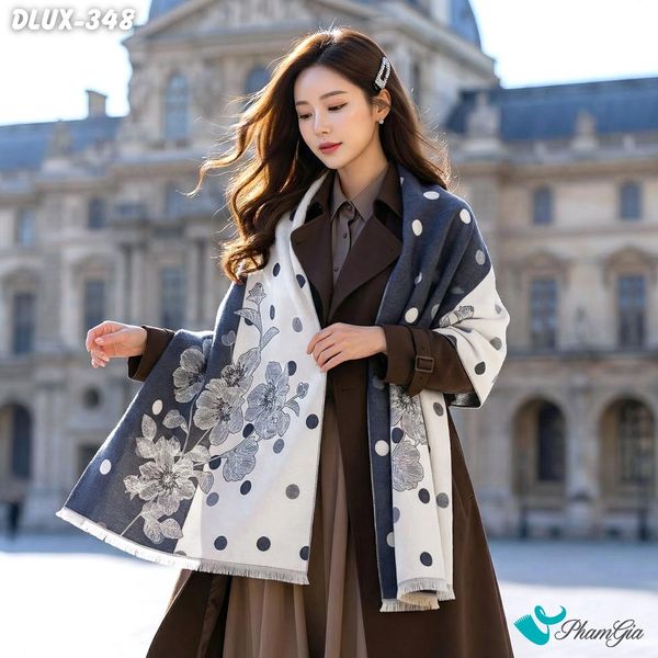 Khăn Choàng Dạ Cashmere Cao Cấp Họa Tiết Hoa Chấm Bi Màu Xám Hiện Đại (DLUX348)