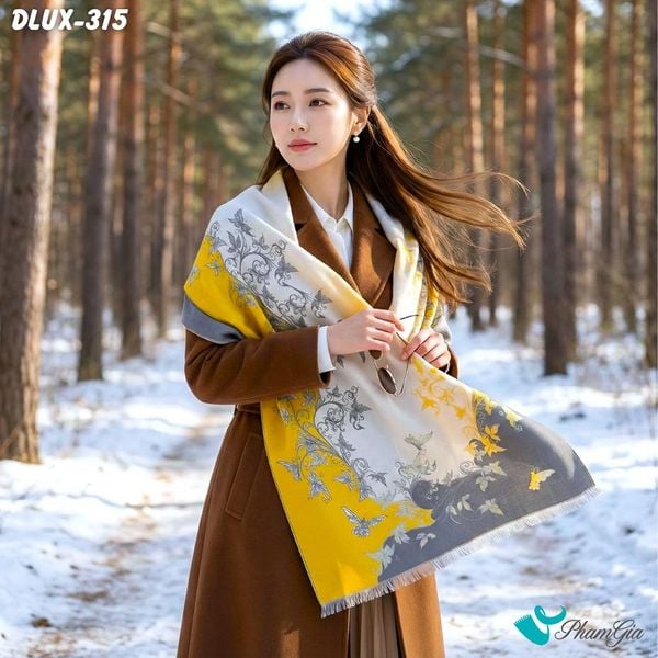 Khăn Choàng Dạ Cashmere Cao Cấp Họa Tiết Hoa Dây Leo Màu Vàng - Xám Trang Nhã (DLUX315)