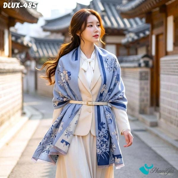 Khăn Choàng Dạ Cashmere Cao Cấp Họa Tiết Hoa Lá Màu Xanh Blue Trang Nhã (DLUX485)