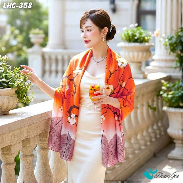 Khăn Choàng Lụa Hàng Châu Họa Tiết Cành Đào Màu Cam Trang Nhã (LHC358)