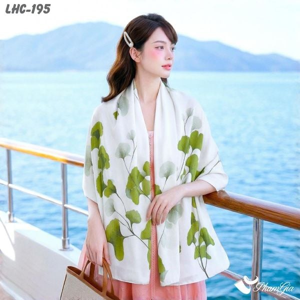Khăn Choàng Lụa Hàng Châu Màu Trắng Họa Tiết Rẻ Quạt Xanh Thanh Lịch (LHC195)