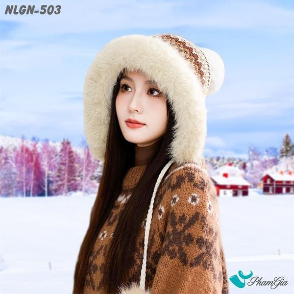Chiếc nón gây ấn tượng bởi phần viền lông dày mịn bao quanh tán nón, vừa tạo điểm nhấn sang trọng vừa giúp giữ ấm vùng đầu và tai hiệu quả. Dáng nón trùm tai có dây buộc pom-pom xinh xắn, mang phong cách cổ điển pha chút dễ thương, phù hợp cho cả đi học, đi làm hay du lịch mùa lạnh.