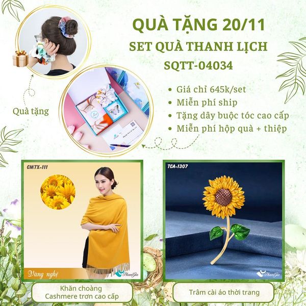 Kết hợp khăn Cashmere trơn cao cấp và Ghim cài áo thời trang với thiết kế thanh lịch và hiện đại, Set Quà Tặng là sự lựa chọn lý tưởng cho các dịp sinh nhật, lễ tết, 20/11, 20/10, 8/3 và các dịp đặc biệt trong năm. Mỗi món phụ kiện được tuyển chọn kỹ lưỡng, đảm bảo chất lượng và sự tinh tế, ấn tượng để gửi tặng người thân, bạn bè, nhân viên, khách hàng, đối tác...