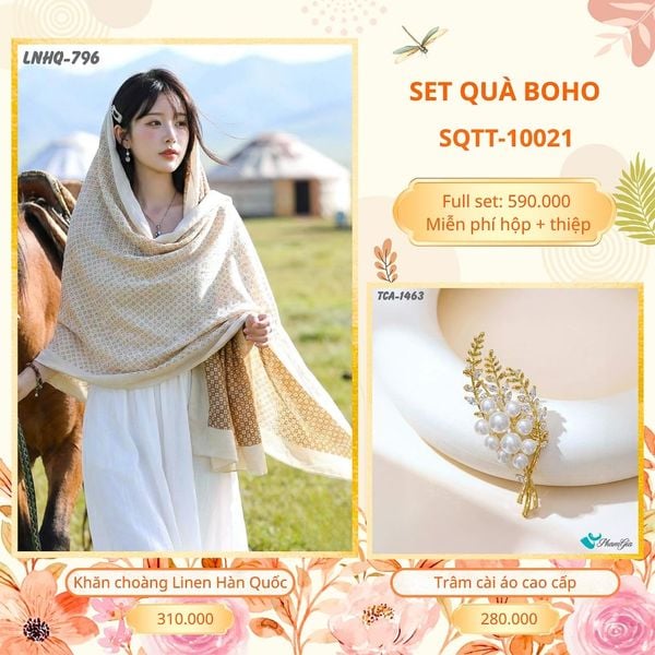 Kết hợp khăn choàng Linen Boho và ghim cài áo với thiết kế ấn tượng và phóng khoáng, Set Quà Tặng Boho là sự lựa chọn lý tưởng cho các dịp sinh nhật, lễ tết, 20/11, 20/10, 8/3 và các dịp đặc biệt trong năm. Mỗi món phụ kiện được tuyển chọn kỹ lưỡng, đảm bảo chất lượng và sự tinh tế, ấn tượng để gửi tặng người thân, bạn bè, nhân viên, khách hàng, đối tác...