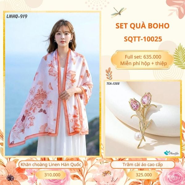 Kết hợp khăn choàng Linen Boho và ghim cài áo với thiết kế ấn tượng và phóng khoáng, Set Quà Tặng Boho là sự lựa chọn lý tưởng cho các dịp sinh nhật, lễ tết, 20/11, 20/10, 8/3 và các dịp đặc biệt trong năm. Mỗi món phụ kiện được tuyển chọn kỹ lưỡng, đảm bảo chất lượng và sự tinh tế, ấn tượng để gửi tặng người thân, bạn bè, nhân viên, khách hàng, đối tác...