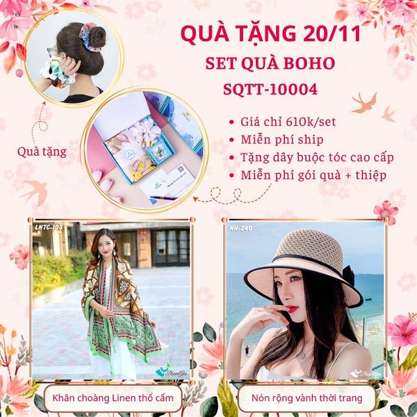 Kết hợp khăn choàng Linen boho họa tiết thổ cẩm và nón rộng vành với thiết kế ấn tượng và phóng khoáng, Set Quà Tặng Boho là sự lựa chọn lý tưởng cho các dịp sinh nhật, lễ tết, 20/11, 20/10, 8/3 và các dịp đặc biệt trong năm. Mỗi món phụ kiện được tuyển chọn kỹ lưỡng, đảm bảo chất lượng và sự tinh tế, ấn tượng để gửi tặng người thân, bạn bè, nhân viên, khách hàng, đối tác...
