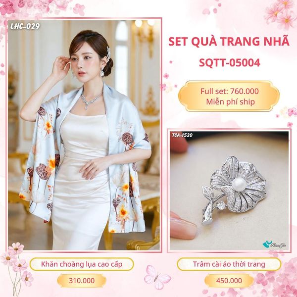 Kết hợp khăn lụa và trâm cài áo với thiết kế tinh tế và sang trọng, Set Quà Tặng là sự lựa chọn lý tưởng cho các dịp sinh nhật, lễ tết, 20/11, 20/10, 8/3 và các dịp đặc biệt trong năm. Mỗi món phụ kiện được tuyển chọn kỹ lưỡng, đảm bảo chất lượng và sự tinh tế, ấn tượng để gửi tặng người thân, bạn bè, nhân viên, khách hàng, đối tác...
