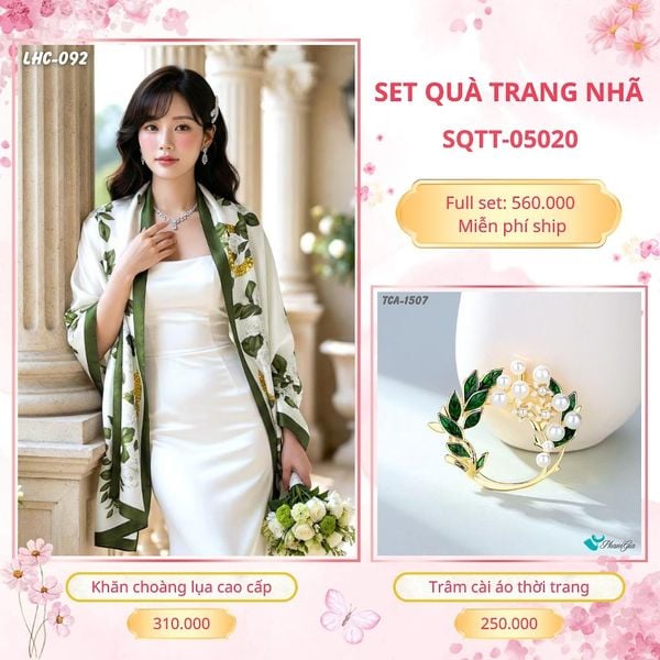 Kết hợp khăn lụa và trâm cài áo với thiết kế tinh tế và sang trọng, Set Quà Tặng là sự lựa chọn lý tưởng cho các dịp sinh nhật, lễ tết, 20/11, 20/10, 8/3 và các dịp đặc biệt trong năm. Mỗi món phụ kiện được tuyển chọn kỹ lưỡng, đảm bảo chất lượng và sự tinh tế, ấn tượng để gửi tặng người thân, bạn bè, nhân viên, khách hàng, đối tác...