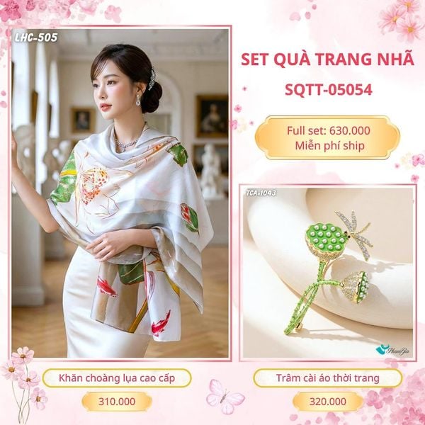 Kết hợp khăn lụa và trâm cài áo với thiết kế tinh tế và sang trọng, Set Quà Tặng là sự lựa chọn lý tưởng cho các dịp sinh nhật, lễ tết, 20/11, 20/10, 8/3 và các dịp đặc biệt trong năm. Mỗi món phụ kiện được tuyển chọn kỹ lưỡng, đảm bảo chất lượng và sự tinh tế, ấn tượng để gửi tặng người thân, bạn bè, nhân viên, khách hàng, đối tác...