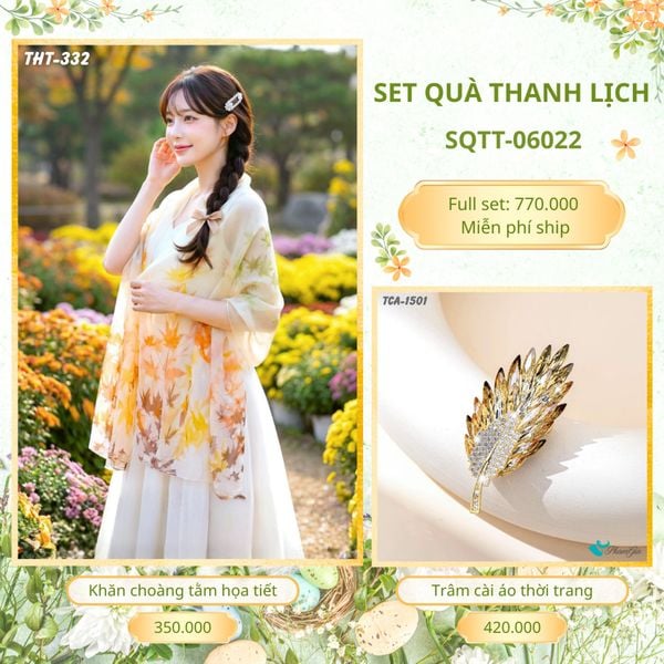Kết hợp khăn choàng Tằm họa tiết cao cấp và Trâm cài áo thời trang với thiết kế sang trọng và Thanh Lịch, Set Quà Tặng là sự lựa chọn lý tưởng cho các dịp sinh nhật, lễ tết, 20/11, 20/10, 8/3 và các dịp đặc biệt trong năm. Mỗi món phụ kiện được tuyển chọn kỹ lưỡng, đảm bảo chất lượng và sự tinh tế, ấn tượng để gửi tặng người thân, bạn bè, nhân viên, khách hàng, đối tác...