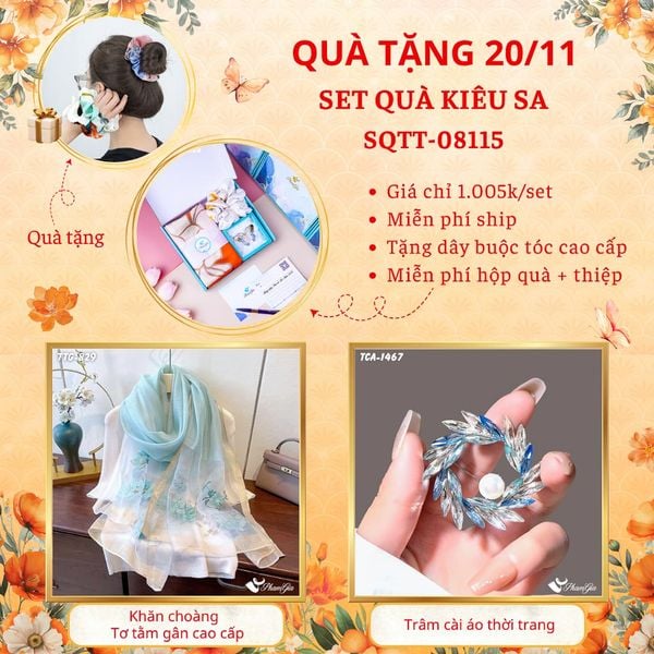 Kết hợp khăn choàng tơ tằm gân và ghim cài áo với thiết kế ấn tượng và sang trọng, Set Quà Tặng Kiêu Sa là sự lựa chọn lý tưởng cho các dịp sinh nhật, lễ tết, 20/11, 20/10, 8/3 và các dịp đặc biệt trong năm. Mỗi món phụ kiện được tuyển chọn kỹ lưỡng, đảm bảo chất lượng và sự tinh tế, ấn tượng để gửi tặng người thân, bạn bè, nhân viên, khách hàng, đối tác...