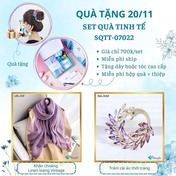 Kết hợp khăn linen loang vintage và ghim cài áo tinh tế với phong cách sang trọng và thanh lịch, Set Quà Tặng là lựa chọn lý tưởng cho các dịp sinh nhật, lễ tết, 20/11, 20/10, 8/3 và những dịp đặc biệt trong năm. Mỗi món phụ kiện đều được tuyển chọn kỹ lưỡng, đảm bảo chất lượng và mang đến sự tinh tế, ấn tượng để gửi tặng người thân, bạn bè, nhân viên, khách hàng, đối tác...