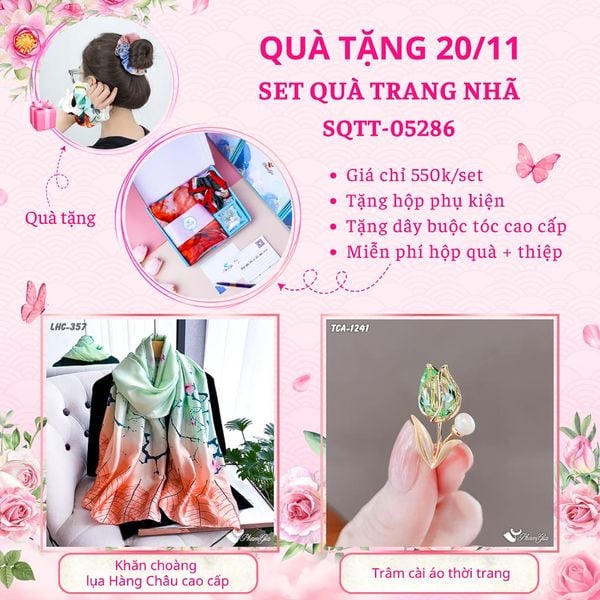 Kết hợp khăn lụa và ghim cài áo với thiết kế tinh tế và sang trọng, Set Quà Tặng là sự lựa chọn lý tưởng cho các dịp sinh nhật, lễ tết, 20/11, 20/10, 8/3 và các dịp đặc biệt trong năm. Mỗi món phụ kiện được tuyển chọn kỹ lưỡng, đảm bảo chất lượng và sự tinh tế, ấn tượng để gửi tặng người thân, bạn bè, nhân viên, khách hàng, đối tác...