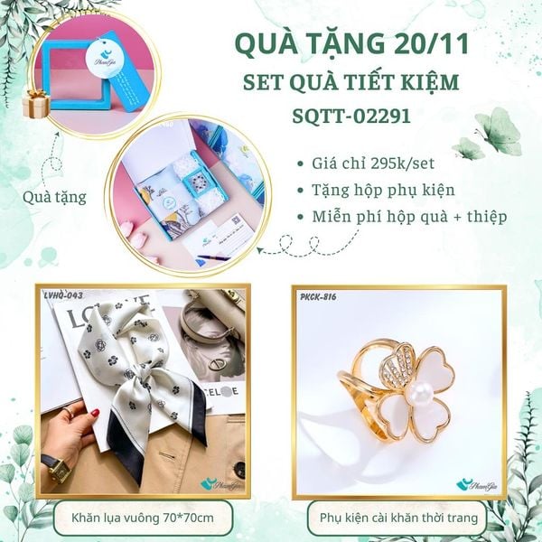 Kết hợp khăn Lụa vuông 70*70cm và Phụ kiện cài khăn thời trang với thiết kế đồng bộ và thanh lịch, Set Quà Tặng Tiết Kiệm là sự lựa chọn lý tưởng cho các dịp sinh nhật, lễ tết, 20/11, 20/10, 8/3 và các dịp đặc biệt trong năm. Mỗi món phụ kiện được tuyển chọn kỹ lưỡng, đảm bảo chất lượng và sự tinh tế, ấn tượng để gửi tặng người thân, bạn bè, nhân viên, khách hàng, đối tác...