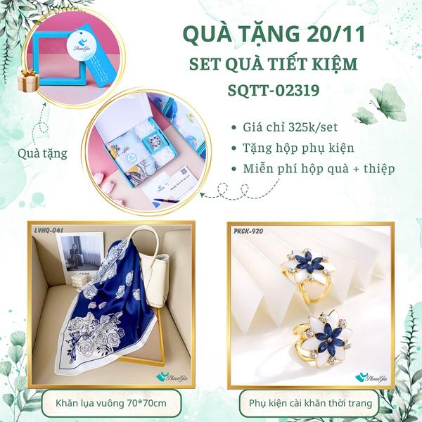 Kết hợp khăn Lụa vuông 70*70cm và Phụ kiện cài khăn thời trang với thiết kế đồng bộ và thanh lịch, Set Quà Tặng Tiết Kiệm là sự lựa chọn lý tưởng cho các dịp sinh nhật, lễ tết, 20/11, 20/10, 8/3 và các dịp đặc biệt trong năm. Mỗi món phụ kiện được tuyển chọn kỹ lưỡng, đảm bảo chất lượng và sự tinh tế, ấn tượng để gửi tặng người thân, bạn bè, nhân viên, khách hàng, đối tác...