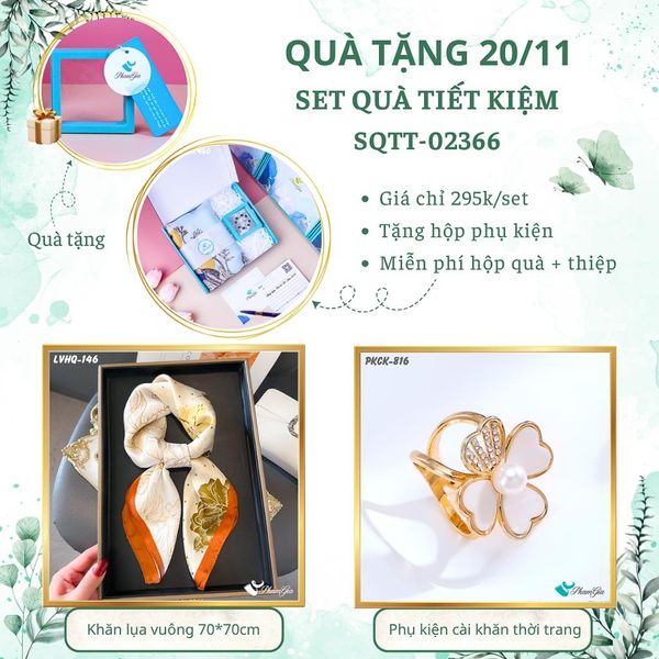 Kết hợp khăn Lụa vuông 70*70cm và Phụ kiện cài khăn thời trang với thiết kế đồng bộ và thanh lịch, Set Quà Tặng Tiết Kiệm là sự lựa chọn lý tưởng cho các dịp sinh nhật, lễ tết, 20/11, 20/10, 8/3 và các dịp đặc biệt trong năm. Mỗi món phụ kiện được tuyển chọn kỹ lưỡng, đảm bảo chất lượng và sự tinh tế, ấn tượng để gửi tặng người thân, bạn bè, nhân viên, khách hàng, đối tác...
