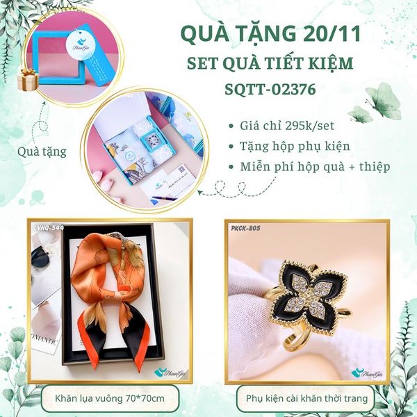Kết hợp khăn Lụa vuông 70*70cm và Phụ kiện cài khăn thời trang với thiết kế đồng bộ và thanh lịch, Set Quà Tặng Tiết Kiệm là sự lựa chọn lý tưởng cho các dịp sinh nhật, lễ tết, 20/11, 20/10, 8/3 và các dịp đặc biệt trong năm. Mỗi món phụ kiện được tuyển chọn kỹ lưỡng, đảm bảo chất lượng và sự tinh tế, ấn tượng để gửi tặng người thân, bạn bè, nhân viên, khách hàng, đối tác...