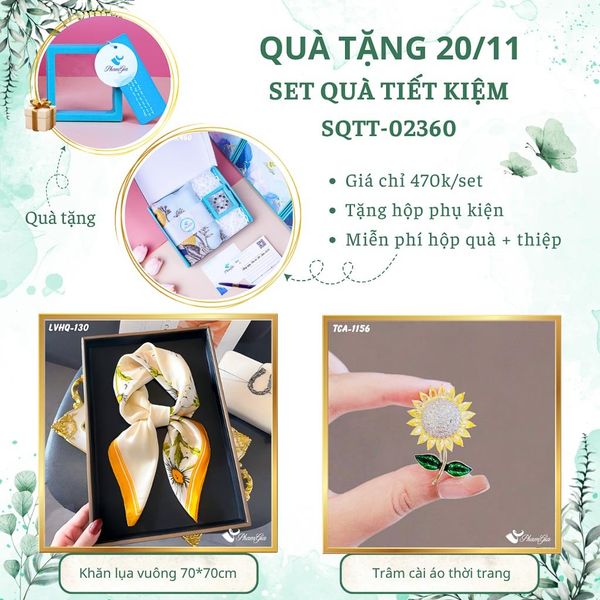 Kết hợp khăn Lụa vuông 70*70cm và Trâm Cài Áo thời trang với thiết kế đồng bộ và thanh lịch, Set Quà Tặng Tiết Kiệm là sự lựa chọn lý tưởng cho các dịp sinh nhật, lễ tết, 20/11, 20/10, 8/3 và các dịp đặc biệt trong năm. Mỗi món phụ kiện được tuyển chọn kỹ lưỡng, đảm bảo chất lượng và sự tinh tế, ấn tượng để gửi tặng người thân, bạn bè, nhân viên, khách hàng, đối tác...