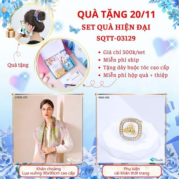 Kết hợp khăn lụa vuông 90*90cm và Phụ kiện cài khăn với thiết kế hiện đại và thanh lịch, Set Quà Tặng là sự lựa chọn lý tưởng cho các dịp sinh nhật, lễ tết, 20/11, 20/10, 8/3 và các dịp đặc biệt trong năm. Mỗi món phụ kiện được tuyển chọn kỹ lưỡng, đảm bảo chất lượng và sự tinh tế, ấn tượng để gửi tặng người thân, bạn bè, nhân viên, khách hàng, đối tác...
